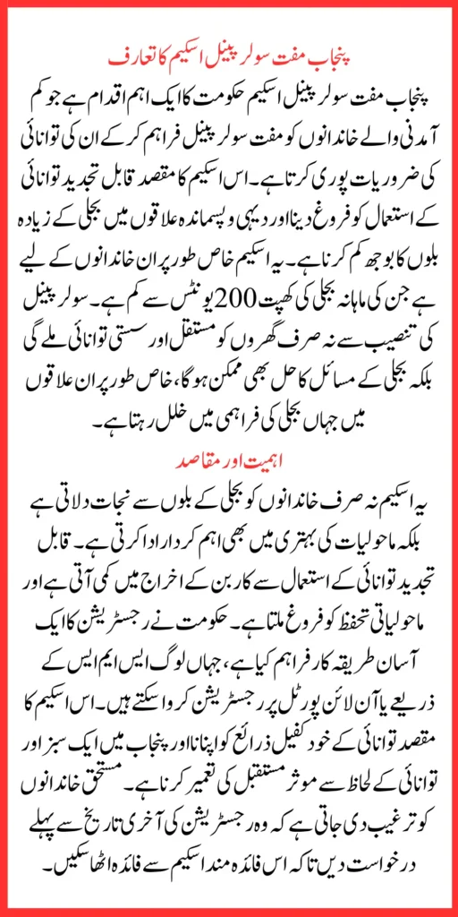 This article will provide complete information about the Punjab Solar Panel Scheme. This scheme not only helps families save on electricity bills but also contributes to environmental conservation by encouraging the use of green energy. Solar panels installed under this program will power homes, small businesses, or agricultural tube wells, enabling beneficiaries to meet their energy needs sustainably. By supporting renewable energy adoption, the Punjab Free Solar Panel Scheme empowers communities, improves living standards, and supports the government’s vision of a greener and energy-efficient future.